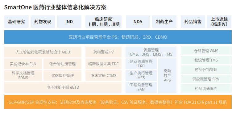 我們?yōu)槿虻纳镝t(yī)藥公司提供醫(yī)藥行業(yè)從研發(fā)到生產(chǎn)的整體信息化解決方案,基于公司自主研發(fā)產(chǎn)品“一智通SmartOne”。幫助生物醫(yī)藥公司實現(xiàn)數(shù)字化轉(zhuǎn)型,降低成本、保障品質(zhì)、提高效率。